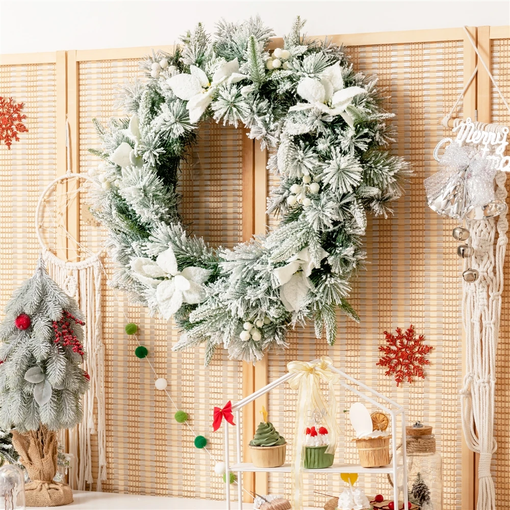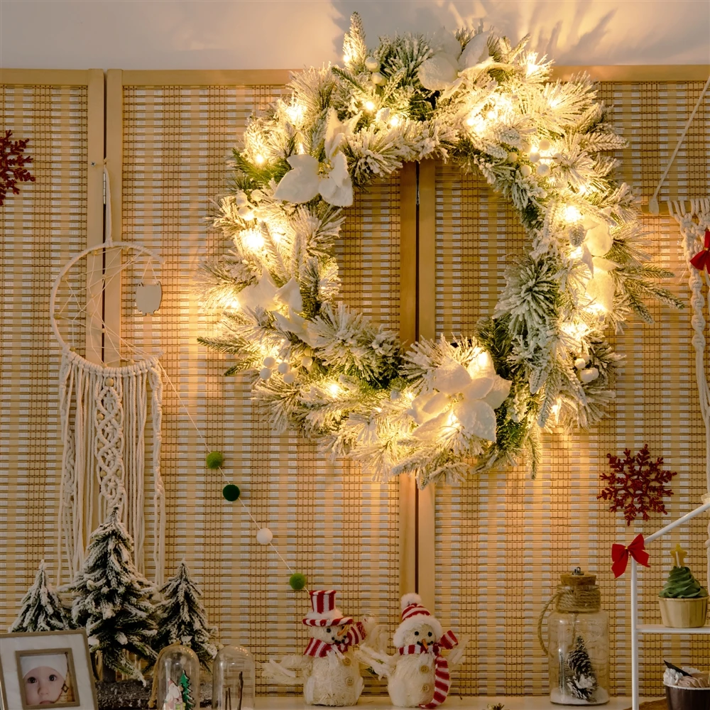 Costway 24-in Pre-lit Snowy Christmas Wreath With Berries Poinsettia Flowers Timer