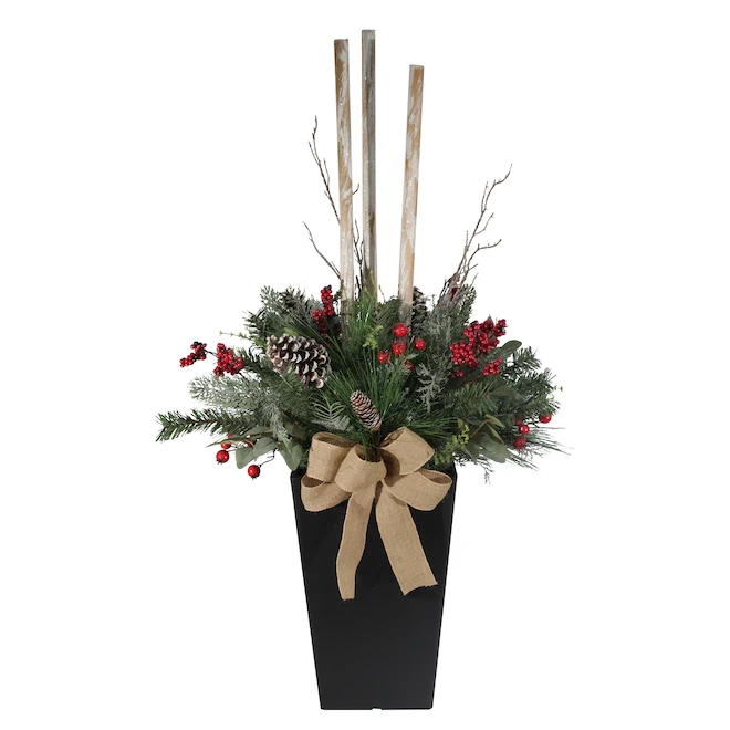 The faux potted plant features an arrangement of faux berries, mixed tips, twigs and pinecones housed inside a rectangle pot for a classic, upscale look. Twigs and faux birch logs add height in the center of pot with burlap bow in the front center with 25 warm white LED lights illuminate the greenery with constant glow. At 50-in H great as an accent décor for your living room hearth,an end table or on the front porch to create a welcoming space. Porch decor requires 3 AA batteries (not included) and includes on/off/timer options (6 hrs ON/18 hrs OFF). Indoor and sheltered outdoor use.