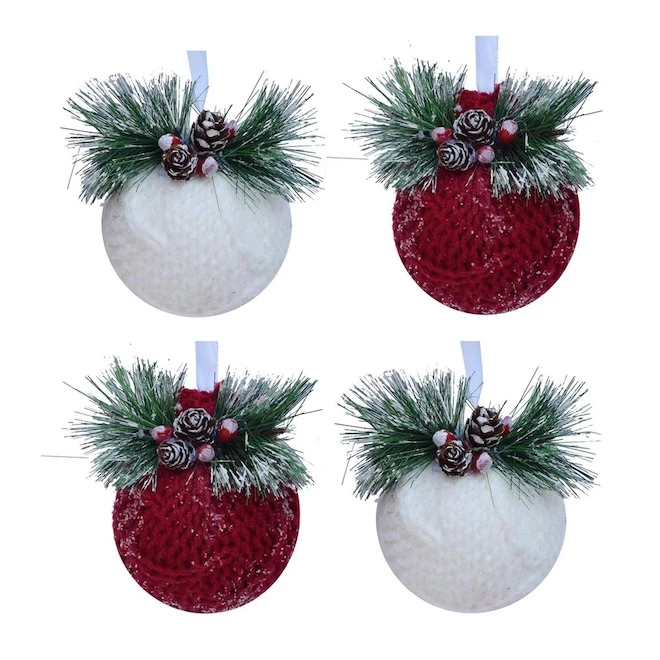 4 pack ball ornament set from the family gathering collection brightens up your holiday decoration. Each handmade piece is constructed of foam filled fabric materials with both featuring a berry and evergreen branch tip on top.