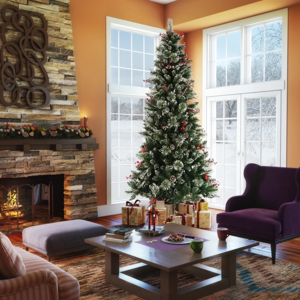This beautiful tree comes unlit, has 744 lightly frosted green PVC tips accented with pine cones, vines, and berries on metal hinged branches. A sturdy metal tree stand is included.